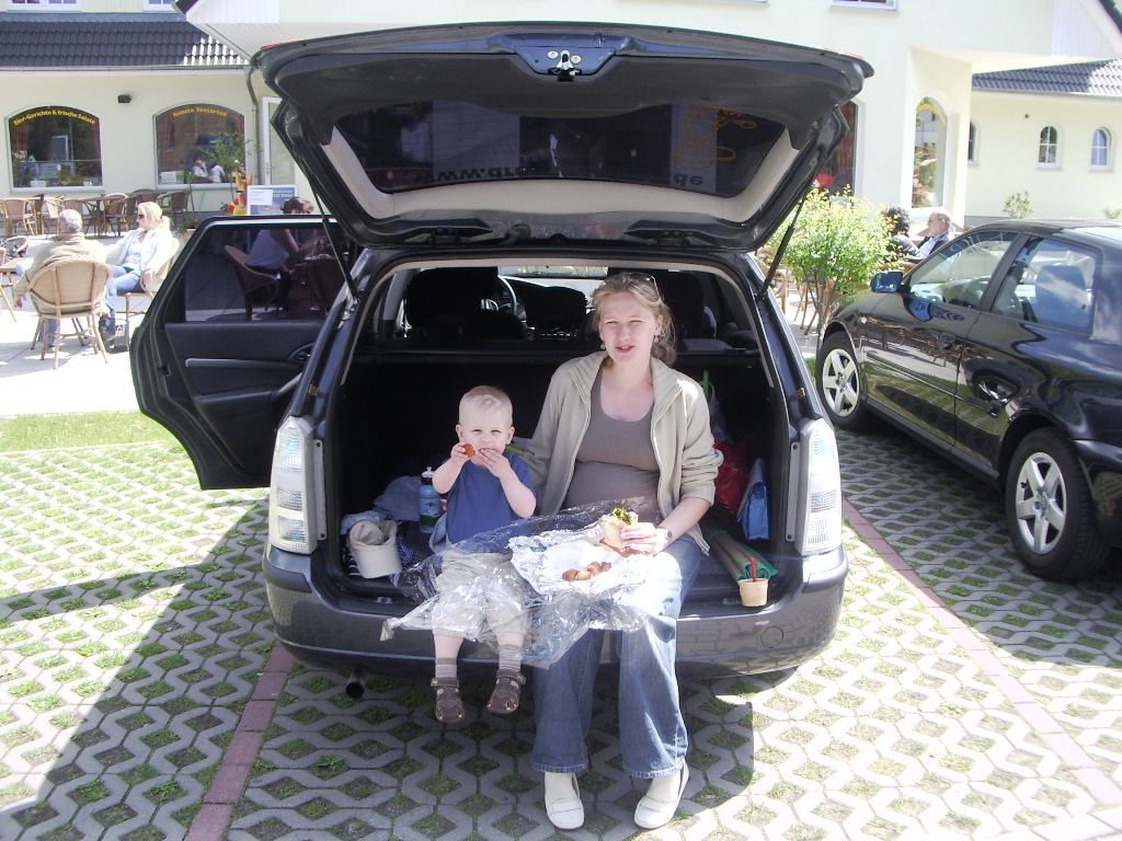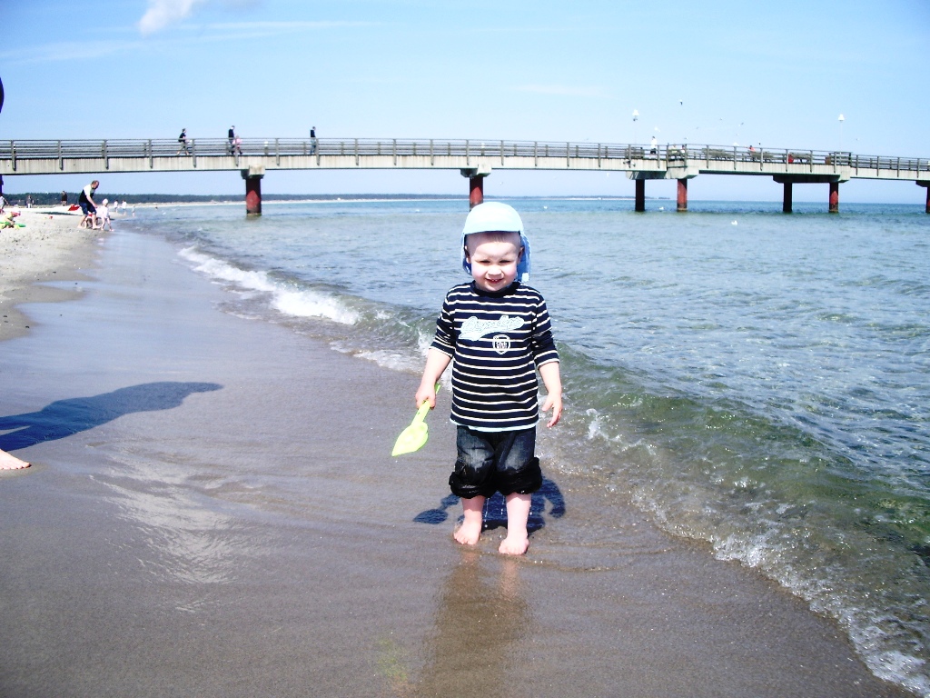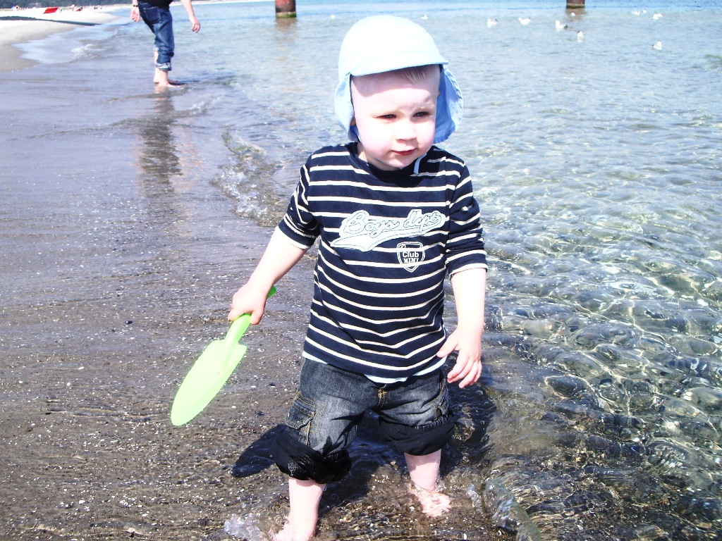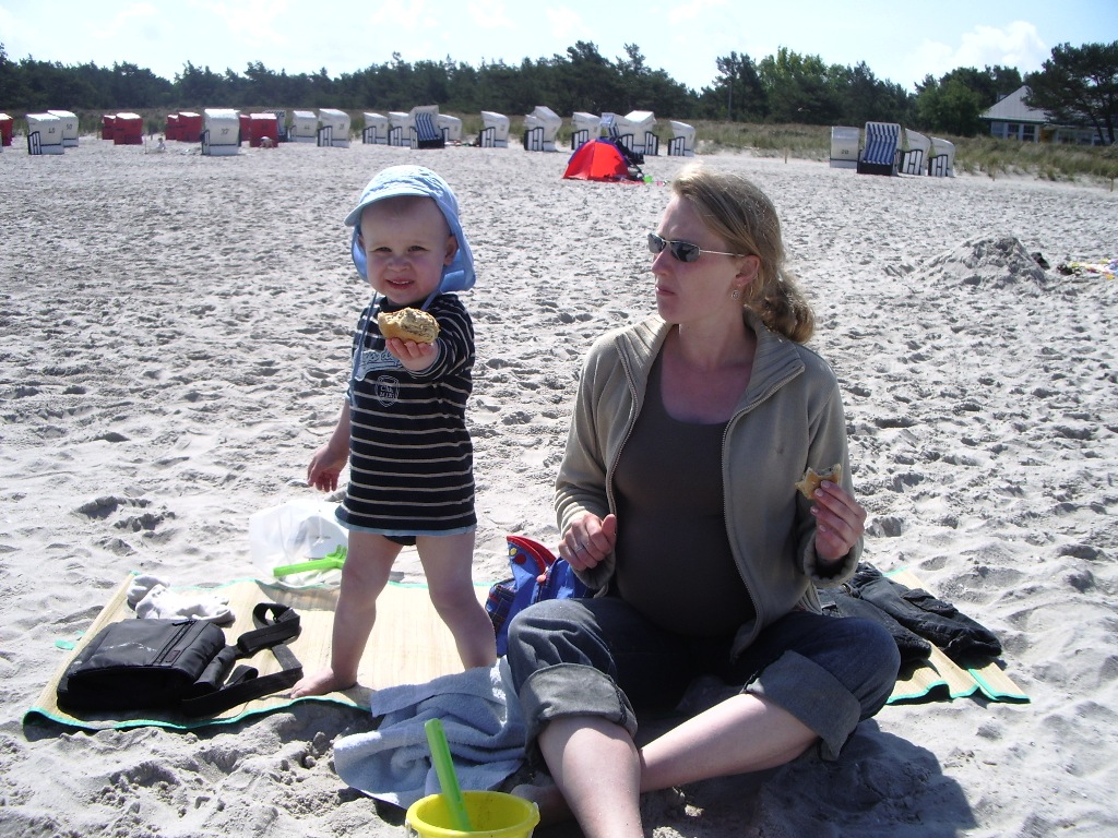 Da die Sonne schon früh am morgen lachte, beschlossen wir gleich nach dem Frühstück an den Strand nach Prerow zu fahren. Adrian war begeistert vom vielen Sand und dem Meerwasser, er war ständig damit beschäftigt, den Sand und die Steine vom Strand ins Wasser zu befördern. Und dabei fand er auch auf Anhieb einen Hühnergott. Am Nachmittag konnten wir Adrian in den lieben Händen der Babysitterin im Kinderland im Hotel lassen und eine Runde auf dem Bodden rudern. Das heißt, Frank ruderte mich über das Wasser 🙂 .